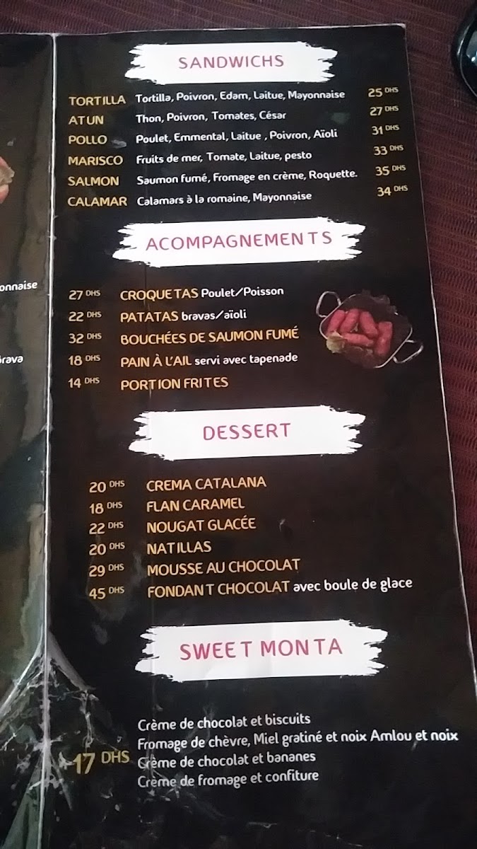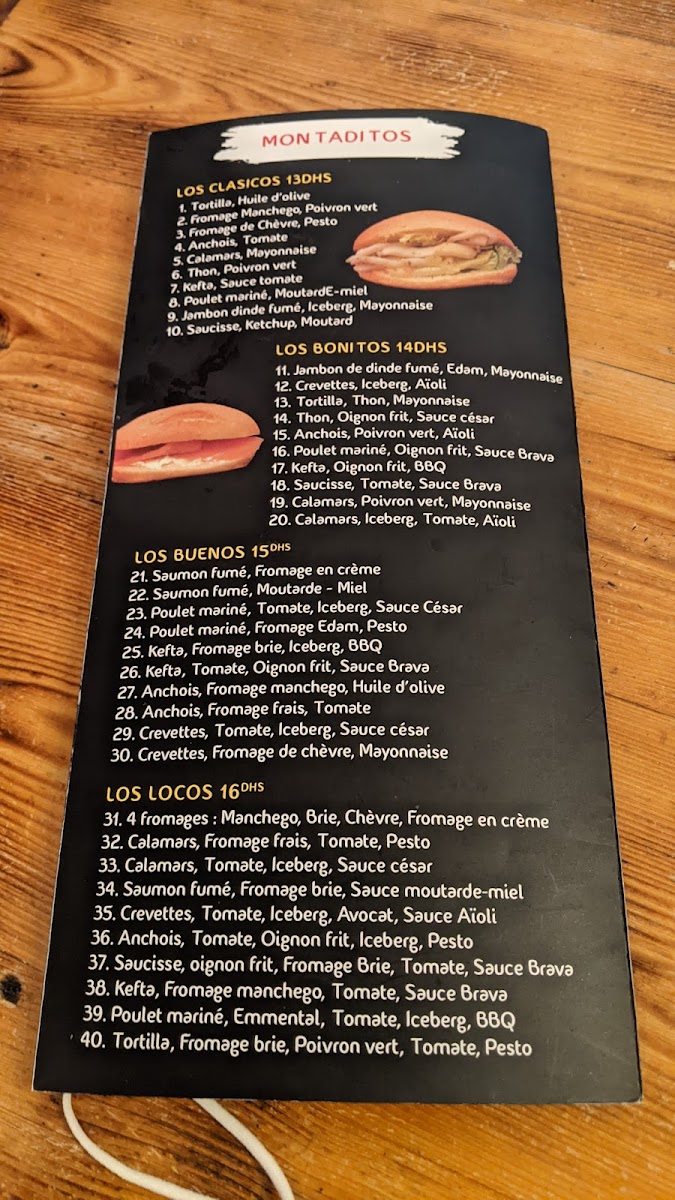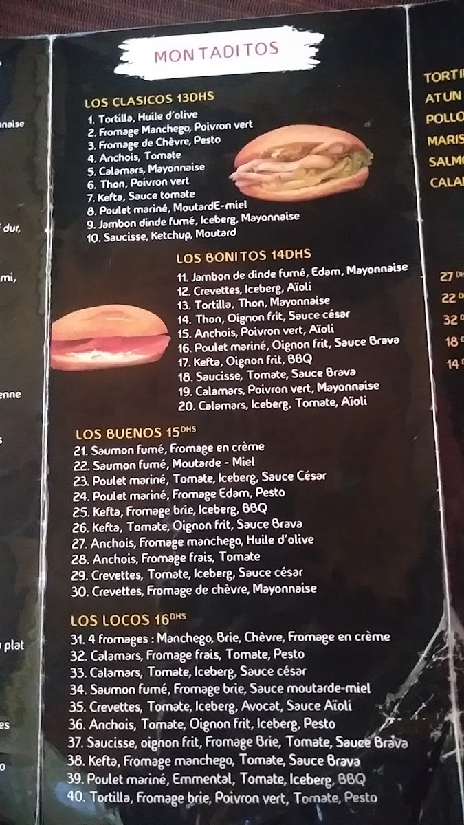The Montaditos section is a highlight, with small sandwiches packed with bold flavors. You can choose from a variety of fillings like the tender Montaditos Poulet (chicken), the crispy Montaditos Calamar (squid), or the delightful Montaditos Avocat Crevettes (avocado and shrimp). For a more zesty experience, try the Montaditos Poulet Sauce Bravas. If you're a fan of cured meats, the Montaditos Jambon (ham) is an excellent choice.